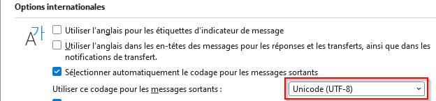 4) Sous "Options internationales" vous pouvez sélectionner "Unicode UTF-8" :